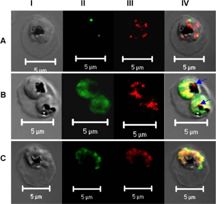 Subcellular localization of PfPRL. Micrographs represent the co-staining profiles of PfPRL with the Golgi marker PfErd2 (A), the ER marker PfBip (B), and the rhoptry/micronemal protein PfAMA-1 (C). Synchronous 3D7 parasite cultures were probed with purified rabbit anti-PfPRL in combination with antibodies to the compartmental markers. Binding of primary antibodies was detected using Alexa-Fluor 488 conjugated antibodies (organellar markers) and Alexa-Fluor 555-conjugated anti-rabbit IgG (PfPRL). Panel I is differential interference contrast image, panel II is fluorescence due to Alexa-Fluor 488 (green), panel III fluorescence due to Alexa-Fluor 555 (red), while panel IV is a merge of the first three panels. Yellow spots indicate overlap between PfPRL and the respective organellar marker, while blue arrows indicate food PfPRL-associated sites in the digestive vacuole.Pendyala PR, Ayong L, Eatrides J, Schreiber M, Pham C, Chakrabarti R, Fidock DA, Allen CM, Chakrabarti D. Characterization of a PRL protein tyrosine phosphatase from Plasmodium falciparum. Mol Biochem Parasitol. 2008 158(1):1-10.