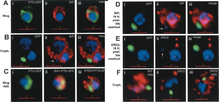 Stage-specific localization of apicoplast-targeted GFP and the effects of brefeldin A (bfa). Distribution of green fluorescence and PfBiP (red) in a early-ring (A, i–iii) and a trophozoite (B, i–iii; a late, 33 h, trophozoite with two nuclei stained in blue is shown). Distribution of green fluorescence and indicated secretory marker (red) in: rings incubated with Bfa for 24 h (C, i–iii); rings incubated with Bfa for 24 h, washed, and grown for 18 h in absence of drug (D, i–iii; E, i–iii); and trophozoites incubated with or without Bfa (F, i–iii). Blue indicates DNA stained with Hoechst 33342. White arrows in B, ii, D, ii, and E, ii, indicate apicoplast DNA. Scale bars as indicated in microns.Cheresh P, Harrison T, Fujioka H, Haldar K. Targeting the malarial plastid via the parasitophorous vacuole. J Biol Chem. 2002 277:16265-77.