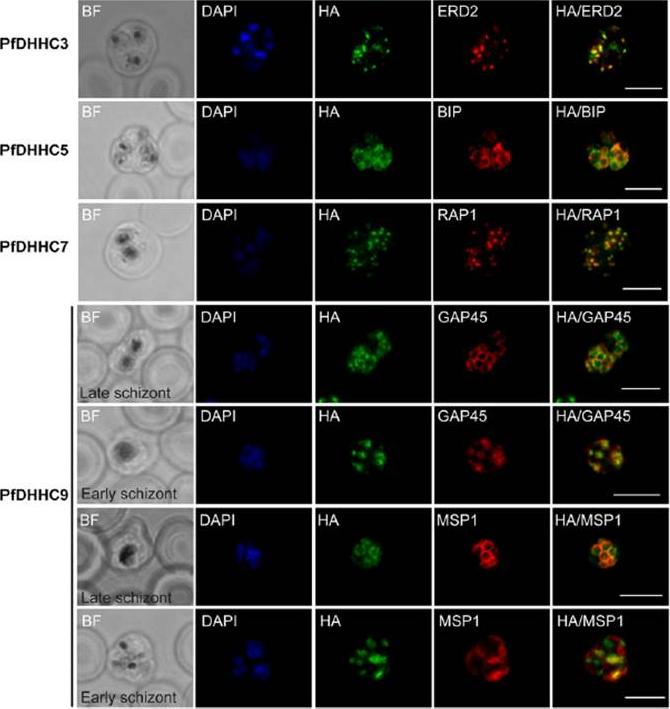 Expression and localization of PfDHHC proteins in Plasmodium falciparum schizonts. Triple-HA-tagged PfDHHC proteins were localized by immuno-fluorescence using antibodies against the 3-HA tag (green). Immunofluorescence staining of each of the tagged PfDHHC proteins was compared against that of the following known localization markers (red): ERD2 (Golgi marker), BIP (endoplasmic reticulum marker), RAP1 (rhoptry marker), GAP45 (inner membrane complex marker) and MSP1 (plasma membrane marker). Nuclear staining by DAPI is shown in blue. For the staining of PfDHHC9 with GAP45 and MSP1, a late schizont, as well as an early schizont, is shown in order to differentiate between inner membrane complex and plasma membrane localization. Scale bar: 5 μm.Tay CL, Jones ML, Hodson N, Theron M, Choudhary JS, Rayner JC. Study of Plasmodium falciparum DHHC palmitoyl transferases identifies a role for PfDHHC9 in gametocytogenesis. Cell Microbiol. 2016 18(11):1596-1610.