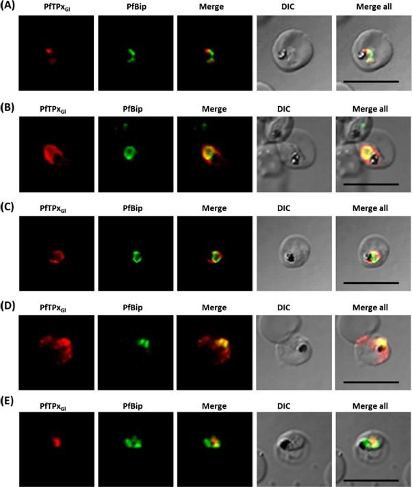 Immunofluorescence images showing the endoplasmic reticulum (ER) morphology in AlF4 and vinblastine treated parasites. (A) PfBiP localization in control parasites for AlF4- treatment, (B) ER morphology in AlF4- treated parasites (14 parasites were counted, none showed dispersal of ER struc-ture), (C) PfBiP localization in solvent (PBS) control parasites for vinblastine treatment, (D) ER morphology in vinblastine-treated parasites (26 parasites were counted, none showed dispersal), (E) ER morphology in parasites reverted after vinblastine treatment (27 parasites counted). Scale Bar: 10 mm. Unlike mammalian cells, no disintegration of the ER was observed in parasites subjected to vinblastine and AlF4-.Both control parasites and drug-treated parasites showed perinuclear ER morphology consistent with the normal development of the ER.Chaudhari R, Dey V, Narayan A, Sharma S, Patankar S. Membrane and luminal proteins reach the apicoplast by different trafficking pathways in the malaria parasite Plasmodium falciparum. PeerJ. 2017 Apr 27;5:e3128.