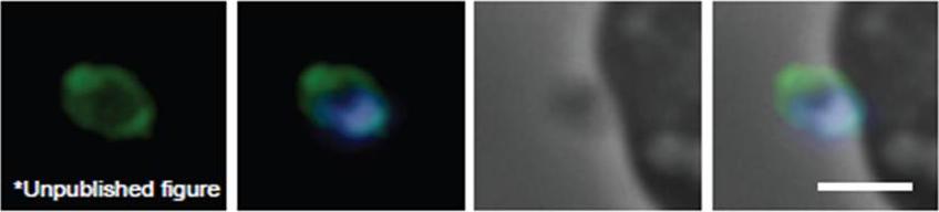 Schizont and merozoite culture was incubated overnight with 0.1µM cytochalasin D to inhibit invasion. Thin smeared on a glass slide, fixed in methanol, stained with rabbit anit-GAP50 polyclonal serum at 1:200 and secondary Alexa-Flor488 anti-Rabbit. Dual color fluorescence images were captured using a Carl Zeiss Axioskop 2 microscope at 100x using Oil immersion. Nucleus is marked with DAPI. Scale bar indicate 1µM. Invading merozoite is shown with GAP50 clearly marking the periphery (shown to be the IMC by immuno-EM).Baum J, Richard D, Healer J, Rug M, Krnajski Z, Gilberger TW, Green JL, Holder AA, Cowman AF. A conserved molecular motor drives cell invasion and gliding motility across malaria life cycle stages and other apicomplexan parasites. J Biol Chem. 2006 281(8):5197-208.