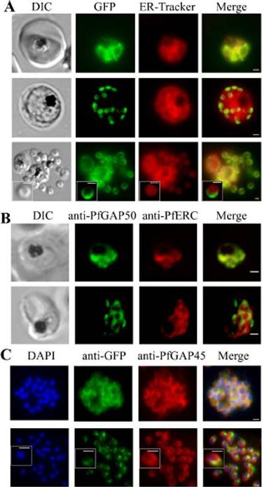 PfGAP50 is located in the ER prior to recruitment to the IMC. A. Parasites expressing PfGAP50-GFP (green) were incubated with ER-Tracker (depicted in red). The GFP and ER-Tracker fluorescence is co-located in trophozoite stage parasites. Upon relocation of GFP fluorescence to the apical ends of nascent merozoites during early schizont stage, the reticular ER-Tracker labelling persists. PfGAP50-GFP is concentrated at one pole of released merozoites while ER Tracker labels internal structures. B. Fixed cell immunofluorescence microscopy of the 3D7 parent strain labelled with antibodies raised against PfGAP50 (green) and PfERC (red). C. Immuno-fluorescence microscopy of PfGAP50-GFP transfectants at the mature and ruptured schizont stages labelled with anti-GFP (green), anti-PfGAP45 (red) and DAPI (blue). Bars = 1 μm. PfGAP50-GFP is located in the endoplasmic reticulum in early stage parasites, then redistributes to apical caps during the formation of daughter merozoites. In the final stage of schizogony the PfGAP50-GFP profile extends further around the merozoite surfaceYeoman JA, Hanssen E, Maier AG, Klonis N, Maco B, Baum J, Turnbull L, Whitchurch CB, Dixonand MW, Tilley L. Tracking glideosome-associated protein-50 reveals the development and organization of the inner membrane complex of P. falciparum. Eukaryot Cell. 2011 10(4):556-64.