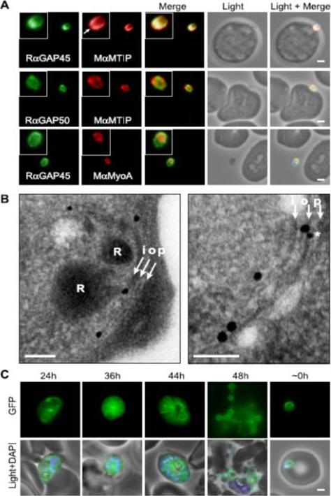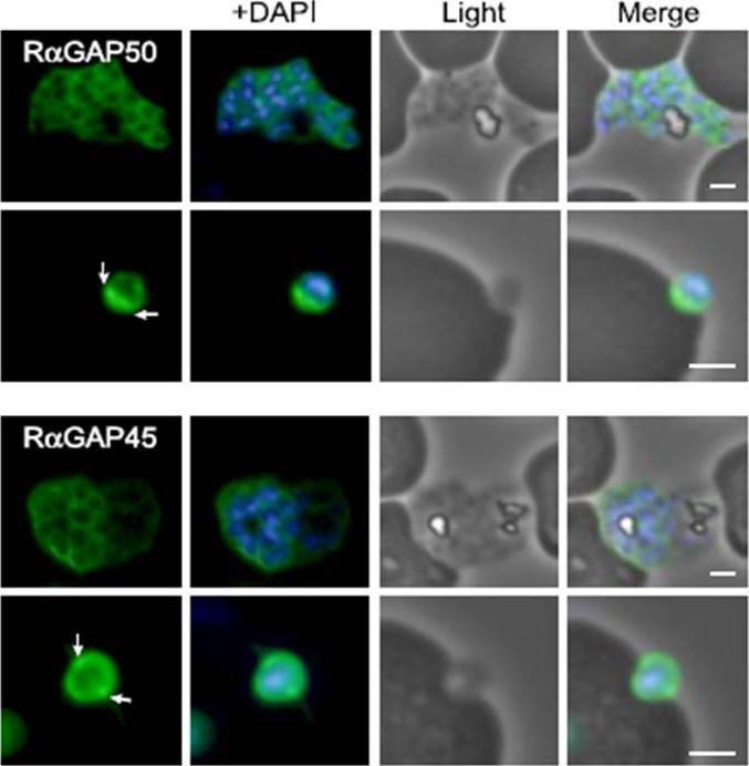 Characterization of PfGAP50 and PfGAP45 proteins. rabbit antiserum against recombinant PfGAP50 localizes to the merozoite periphery and remains following rupturing of schizont, consistent with localization to the IMC. The white arrows on putative invading merozoite point to interface with erythrocyte where increased fluorescence is detectable, possibly indicating concentration at the moving junction. Rabbit antiserum against recombinant PfGAP45 similarly suggests localization to the IMC. A second putative invading merozoite also suggests PfGAP45 is concentrated at the interface (white arrows) with the erythrocyte, consistent with the moving junction. Scale bar, 1 mm.Baum J, Richard D, Healer J, Rug M, Krnajski Z, Gilberger TW, Green JL, Holder AA, Cowman AF. A conserved molecular motor drives cell invasion and gliding motility across malaria life cycle stages and other apicomplexan parasites. J Biol Chem. 2006 281(8):5197-208.