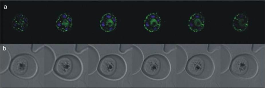 Confocal microscopy of an early schizont transgenically expressing SAP(1-367)-GFP (missing C-terminal sequence). GFP fluorescence was acquired by laser scanning through the parasite producing z stacks. a) Merged images of GFP and Hoechst staining of the nuclei; b) live images of the parasite taken in differential interference contrast. Capturing z-stack images through the parasite, it was possible to deduce the punctate GFP localization as being not only on the parasite’s surface where it might point to the formation of cytostomes but fluorescence was also seen in a more diffuse pattern in the cytosol, which could possibly represent a snapshot of vesicle trafficking. It is also localized in the food vacuole. This gene product was formerly described as anchoring glideosome associated protein 50 (GAP50).Müller IB, Knöckel J, Eschbach ML, Bergmann B, Walter RD, Wrenger C. Secretion of an acid phosphatase provides a possible mechanism to acquire host nutrients by Plasmodium falciparum. Cell Microbiol. 2010 12:677-91. Copyright John Wiley & Sons Ltd. 2010.