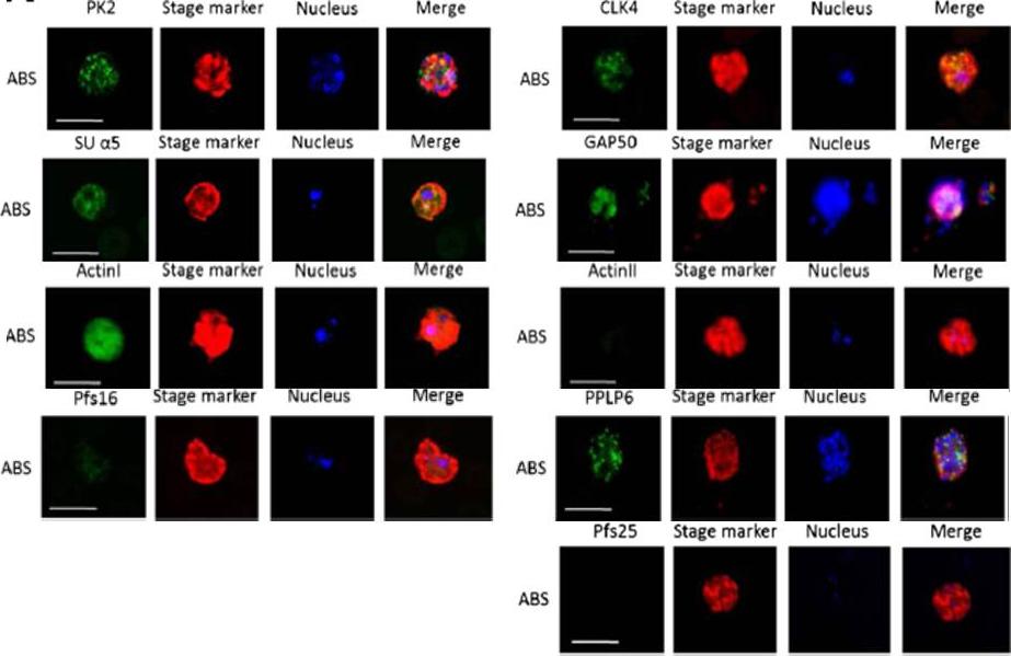 Immunofluorescence assays, using specific antibodies, detected the proteins of interest (in green) in asexual blood stage (ABS) parasites, using MSP1 (in red). Nuclei were highlighted by Hoechst nuclear stain (in blue). Bar, 5 μm. Ngwa CJ, Scheuermayer M, Mair GR, Kern S, Brügl T, Wirth CC, Aminake MN, Wiesner J, Fischer R, Vilcinskas A, Pradel G. Changes in the transcriptome of the malaria parasite Plasmodium falciparum during the initial phase of transmission from the human to the mosquito. BMC Genomics. 2013 Apr 15;14:256