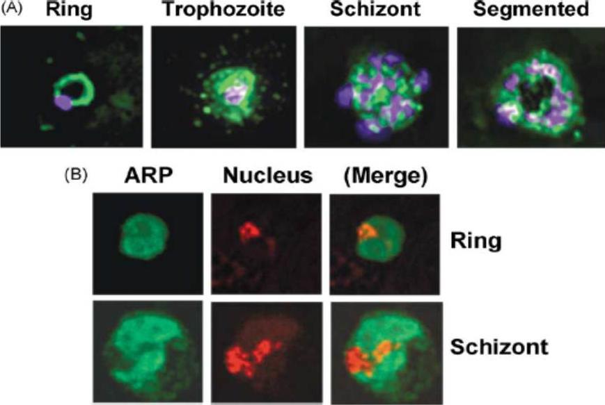 Immunofluorescence microscopy was done as described under Section 2. (A) Thin smears were incubated with rabbit anti-ARP antibody. The secondary antibody was Cy2-conjugated (green), and nuclei were stained with DAPI (purple by computer color rendition). Fluorescence was viewed in a Nikon TE200 microscope equipped with DeltaVision software for deconvolution and reconstruction of 3D volume as described [23]. As and where described, the ring, trophozoite, schizont, and segmented stages of the parasite were probed. (B) The secondary antibody was FITC-conjugated (green), and nuclei were stained with TO-PRO-3 iodide (red). A ring and a schizont are shown as representative examples. The protein was located mainly in the parasitic cytoplasm. Thus, PfARP is a unique cytoplasmic member of the SET/TAF-family and a candidate physiological regulator of the Plasmodium PP2A.Dobson S, Kumar R, Bracchi-Ricard V, Freeman S, Al-Murrani SW, Johnson C, Damuni Z, Chakrabarti D, Barik S. Characterization of a unique aspartate-rich protein of the SET/TAF-family in the human malaria parasite, Plasmodium falciparum, which inhibits protein phosphatase 2A. Mol Biochem Parasitol. 2003 126:239-50. Copyright Elsevier 2009.