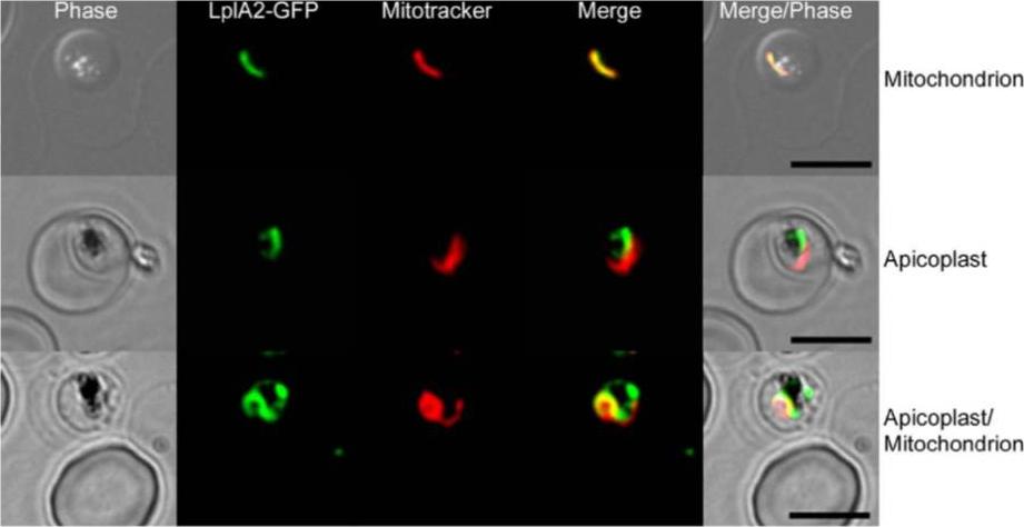 Immunofluorescent analyses were performed on P. falciparum 3D7 using anti-LplA2 and anti-aLipDH (aE3) antibodies (specifically staining the apicoplast of the parasites). Panel 1 shows staining of an organelle distinct from the apicoplast, probably being the mitochondrion. Panel 2 shows costaining of both antibodies, suggesting LplA2 is located in the apicoplast, and panel 3 shows staining of both the apicoplast and potentially the mitochondrion. Scale bars: 5 mm.Günther S, Wallace L, Patzewitz EM, McMillan PJ, Storm J, Wrenger C, Bissett R, Smith TK, Müller S. Apicoplast lipoic acid protein ligase B is not essential for Plasmodium falciparum. PLoS Pathog. 2007 Dec;3(12):e189.