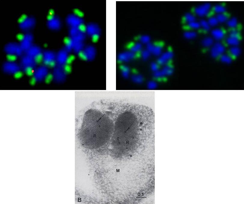 Upper: Localization of RhopH2 in the rhoptries of schizonts with polyclonal and monoclonal Abs.Lower: Electron micrograph of a merozoite (M) reacted with the polyvalent antibodies against the 140 000 mol. wt. protein, followed by Protein A-gold label. Gold particles (arrow) bind specifically to electron dense rhoptries (R) (bar, 0.1 mm).Holder AA, Freeman RR, Uni S, Aikawa M. Isolation of a Plasmodium falciparum rhoptry protein. Mol Biochem Parasitol. 1985 14:293-303.