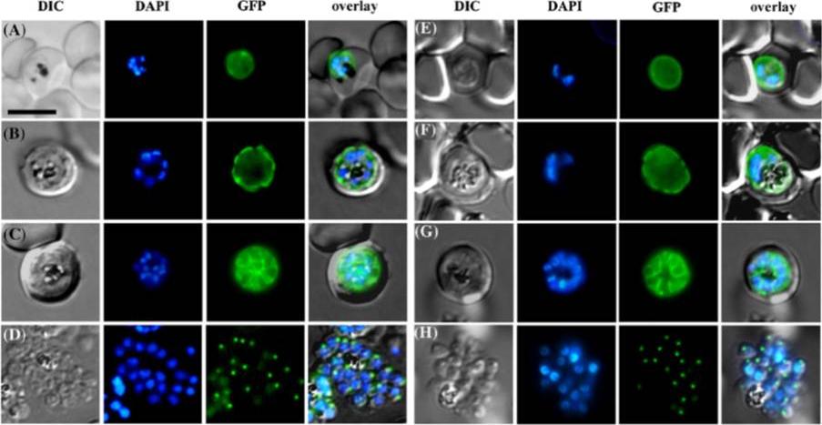 Similar trafficking and subcellular localization of RhopH2-Myc-GFP (A–D) and RhopH2-GFP (E–H) chimeric proteins during late developmental stages of parasite growth. Images were collected from live parasites. (A and E) Early schizont stages showing almost even fluorescence signal in the cytoplasm and probably the parasitophorous vacuole. (B and F) Further developed schizonts showing accumulation of the chimeric proteins around the parasites. (C and G) Later schizont stages showing fluorescence surrounding individual merozoites. Fluorescent vesicles can be seen; probably representing premature rhoptries. (D and H) Segmented schizonts showing concentrated fluorescence signal at the apical end of the formed merozoites. Nuclei were stained with DAPI. Scale bar represents 5 μm.Ghoneim A, Kaneko O, Tsuboi T, Torii M. The Plasmodium falciparum RhopH2 promoter and first 24 amino acids are sufficient to target proteins to the rhoptries. Parasitol Int. 2007 56:31-43. Copyright Elsevier 2009.