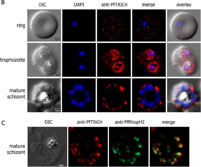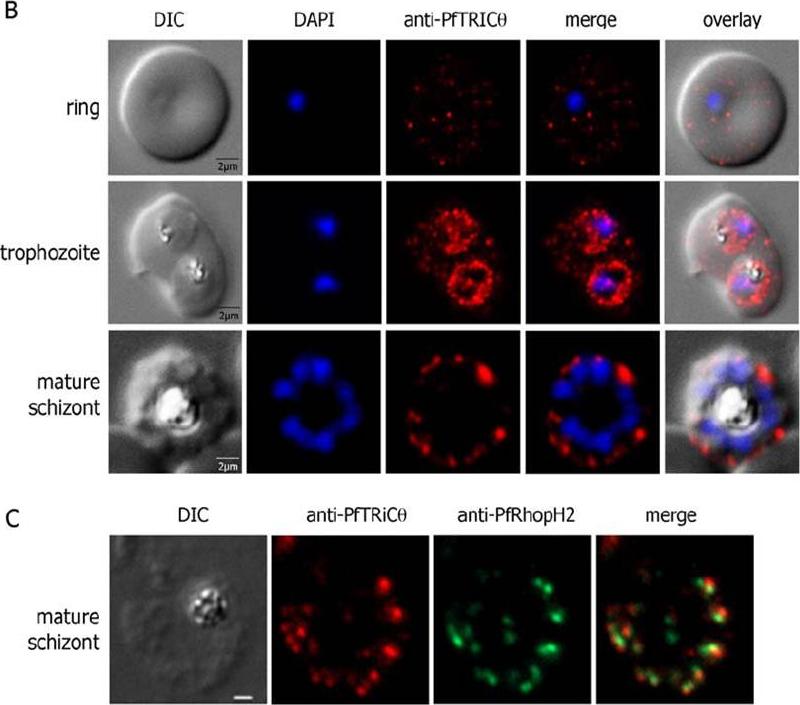 PfTRiC is exported to the cytoplasm of P. falciparum iRBCs. (B) Immuno-fluorescence studies of erythrocyte infected by Pf3D7 at the early (row 1) and mid (row 2) trophozoite stages and at late schizonte stage using PfTRiCθ specific antibodies (in red). DAPI: DAPI staining of the parasite nucleus (in blue). (C) Double IFA labelling of PPfTRiCθ (in red) and the rhoptry protein PfRhopH2 (in green) in segmented schizonts using specific sera and methanol-acetone fixed infected erythrocytes. PfTRiCθ was detected in the iRBC cytosol from early rings to early schizonts. Labelling of the parasite (and possibly the parasitophorous vacuole) was instead observed for mature stages (mature trophozoites to schizonts). Moreover, following the individualization of merozoites, PfTRiCθ was only detected at the apex of each merozoite. Double labelling immunofluorescence experiments using anti-PfTRiCθ and anti-RhopH2 antibodies.Mbengue A, Vialla E, Berry L, Fall G, Audiger N, Demettre-Verceil E, Boteller D, Braun-Breton C. New Export Pathway in Plasmodium falciparum-Infected Erythrocytes: Role of the Parasite Group II Chaperonin, PfTRiC. Traffic. 201516(5):461-75.