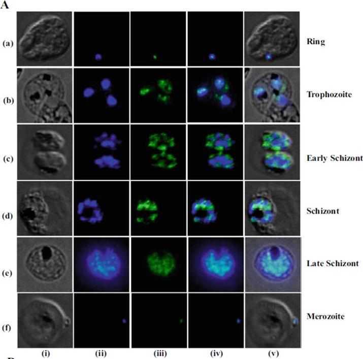 Localization of XPD in P. falciparum 3D7 strain. A Different stages, i.e., ring, trophozoites, schizonts, and merozoites of the P. falciparum 3D7 strain, were fixed and stained with purified anti-PfXPDN antibodies. bright field image (i), image of cell stained with DAPI (ii), munofluorescently stained cell with anti-PfXPDN antibody (iii), merged images of ii and iii (iv), and merged images (v). PfXPD is mostly localized in the nuclear region during all the intraerythrocytic developmental stages (a–f). However, a partial cytoplasmic localization was also observed during trophozoite and schizont stages.Tajedin L, Tarique M, Tuteja R. Plasmodium falciparum XPD translocates in 5'to 3' direction, is expressed throughout the blood stages, and interacts with p44. Protoplasma. 2015 Feb 24. [Epub ahead of print]