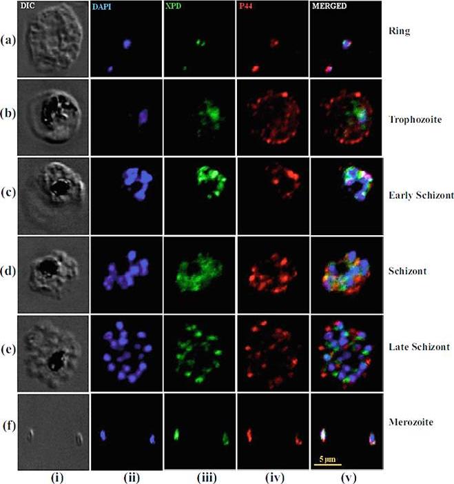Colocalization of XPD and p44 in P. falciparum 3D7 strain. Different stages, i.e., ring, trophozoites, schizonts, and merozoites of the P. falciparum 3D7 strain, were fixed and stained with anti-PfXPDN and anti-Pfp44 antibodies. Bright field image (i), image of cell stained with DAPI (ii), immunofluorescently stained cell with anti-PfXPDN antibody (iii), (iv) immunofluorescently stained cell with anti Pfp44 antibody, and merged images (v). PfXPD and Pfp44 colocalized in the nucleus in all the developmental stages (a–f) particularly during ring and merozoite stages (a and f). Furthermore, both proteins (Pfp44 and PfXPD) colocalized partially in nucleus and cytoplasm during the trophozoite and schizont stages (b–e) of development, but it is interesting to note that Pfp44 was prominently visible in the cytoplasm (iv).Tajedin L, Tarique M, Tuteja R. Plasmodium falciparum XPD translocates in 5'to 3' direction, is expressed throughout the blood stages, and interacts with p44. Protoplasma. 2015 Feb 24. [Epub ahead of print]