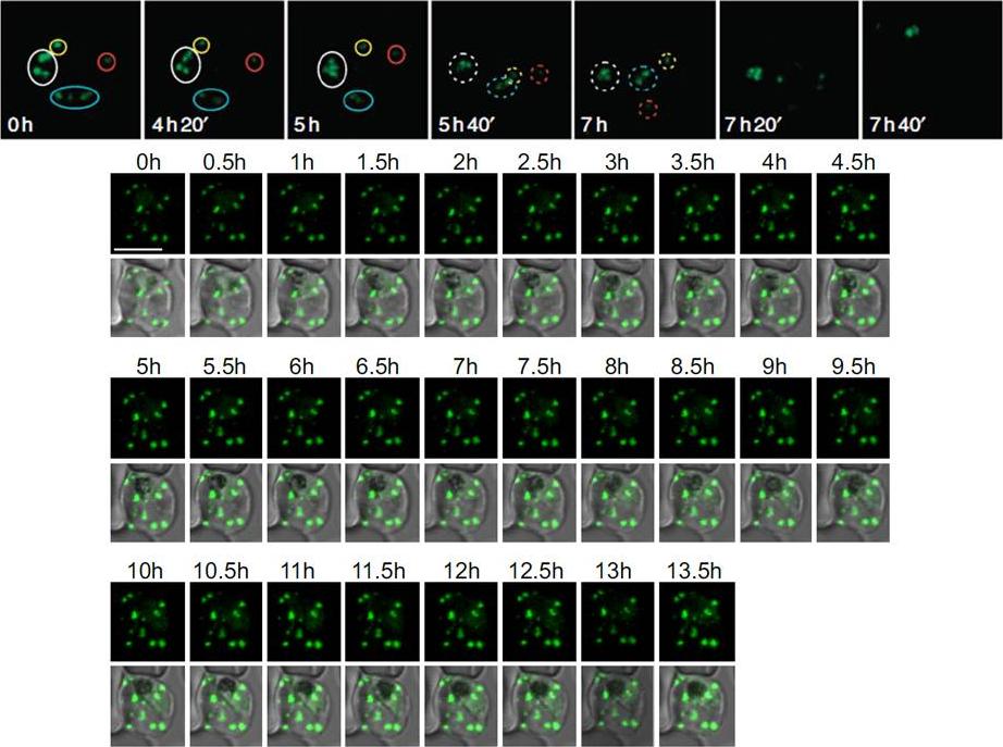 Upper panel: Time of merozoite formation and three states of Maurer’s clefts. Selected time points of 4D imaging (20 min interval) of a REX2-GFP-expressing schizont. Upper rows: maximum intensity projection of 3D reconstructions of GFP fluorescence labelling Maurer’s clefts; bottom rows: single DIC z-section of the corresponding time point. Different groups of clefts are marked with colour-coded circles to show their changing position. The broken lines encircle clefts that cannot be assigned with certainty. In the last time point before rupture, no assignment could be made. Scale bars, 5 μm. REX2-GFP was only detectable from the young trophozoite stage onwards. Unexpectedly, follow-up of these cells through the remainder of the cycle showed that the position and number of Maurer’s clefts in individual cells remained constant until shortly before rupture. Time lapse analysis of the Maurer's clefts in an erythrocyte infected with a parasite expressing REX2-GFPcrt.Grüring C, Heiber A, Kruse F, Ungefehr J, Gilberger TW, Spielmann T. Development and host cell modifications of Plasmodium falciparum blood stages in four dimensions. Nat Commun. 2011 2:165.