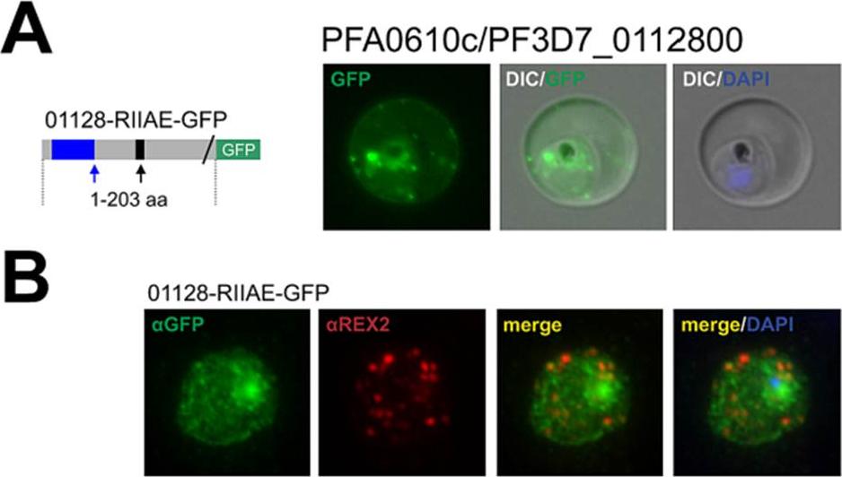 The hyp11 protein encoded by PFA0610c is an exported protein with a non-canonical PEXEL/HT. A. Fluorescence microscopy. The schematic structure of the GFP-tagged proteins is depicted on the left of representative images of iRBCs.The ER-signal is shaded blue, the (non-) canonical PEXEL/HT is shaded black and GFP is shaded green. Putative cleavage sites are indicated by an arrow (blue: SP cleavage site; black: Plasmepsin V cleavage site. B. Immunofluorescence analyses. Antibodies against GFP and the Maurer’s clefts protein were used. Membranes were stained with Bodipy-TR-C5ceramide. The fluorescence of GFP-tagged PFA0610c (01128-RIIAE-GFP), a protein with a R.I.E variant, appeared to be located close to the RBC membrane (A). 01128-RIIAE-GFP did not colocalize with REX2 (B).This indicates that PFA0610cis associated with the RBC membrane. Schulze J, Kwiatkowski M, Borner J, Schlüter H, Bruchhaus I, Burmester T, Spielmann T, Pick C. The Plasmodium falciparum exportome contains non-canonical PEXEL/HT proteins. Mol Microbiol. 2015 Apr 8. [Epub ahead of print]