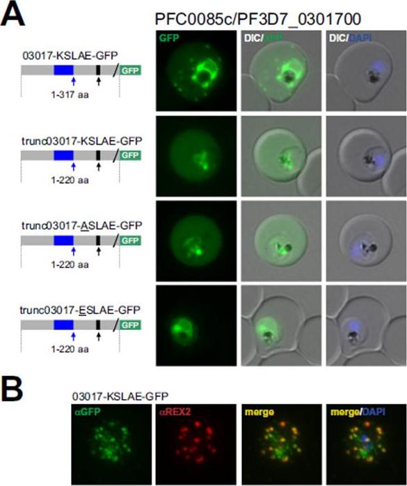 PFC0085c encodes an exported protein with a non-canonical PEXEL/HT. A. Fluorescence microscopy. The schematic structure of the GFP-tagged proteins is depicted on the left of representative images of iRBCs. B. Immunofluorescence analyses. Antibodies against GFP and the Maurer’s clefts protein REX2 were used. The ER-signal is shaded blue, the (non-) canonical PEXEL/HT is shaded black and GFP is shaded green. Putative cleavage sites are indicated by an arrow (blue: SP cleavage site; black: Plasmepsin V cleavage site. Fluorescence of GFP-tagged PFC0085c (03017-KSLAE-GFP), a protein with a K.L.E variant, indicated a Maurer’s clefts localization in addition to a uniformly distributed pool in the iRBC cytoplasm (A). This was confirmed by immunofluorescence analyses, demonstrating that 03017-KSLAE-GFP colocalized with REX2 (B).Schulze J, Kwiatkowski M, Borner J, Schlüter H, Bruchhaus I, Burmester T, Spielmann T, Pick C. The Plasmodium falciparum exportome contains non-canonical PEXEL/HT proteins. Mol Microbiol. 2015 Apr 8. [Epub ahead of print]
