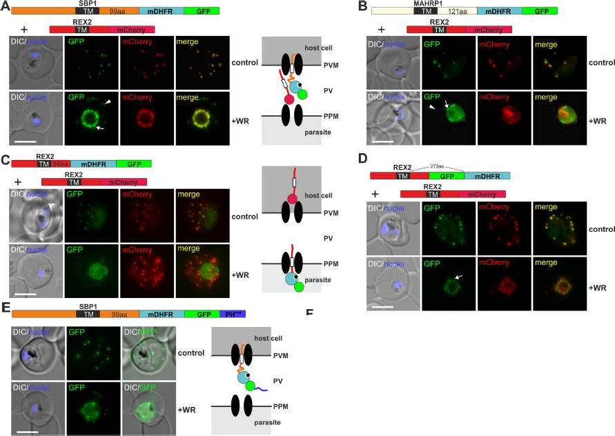 Mouse DHFR fusions can clog the PVM translocon and co-block the export of other proteins. (A-E) Representative images of live P. falciparum parasites grown in the presence (+WR) or absence of WR (control) and expressing the constructs shown schematically above each panel. DIC, differential interference contrast. Arrowheads indicate faint signals at the Maurer’s clefts; arrows show mobile protrusions (note that they do not overlap in the red and the green signal due to movement between capture of the images). Size bars: 5 μm. Schematics to the right show the location of the fusion protein containing the folded WR-bound mDHFR domain (light blue circle with smaller black circle in binding pocket) and the co-expressed REX2 (red line) fused to mCherry (red circle); white box, TM; green circle, GFP; blue line, protease sensitive mutated PH domain.Mesén-Ramírez P, Reinsch F, Blancke Soares A, Bergmann B, Ullrich AK, Tenzer S, Spielmann T. Stable Translocation Intermediates Jam Global Protein Export in Plasmodium falciparum Parasites and Link the PTEX Component EXP2 withTranslocation Activity. PLoS Pathog. 2016 May 11;12(5):e1005618.