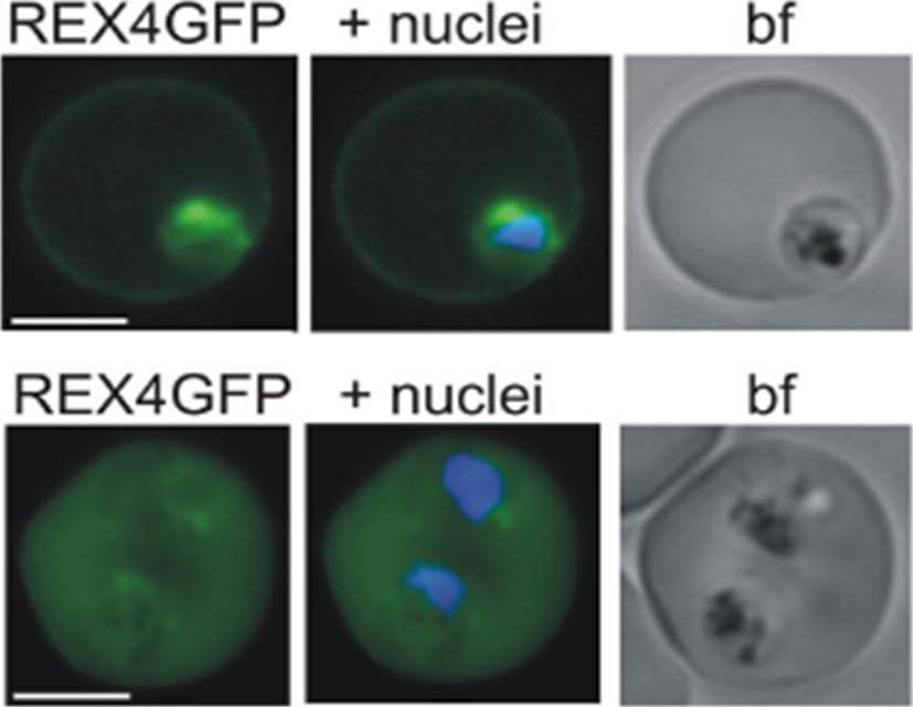 Transgenically expressed REX4 is exported into the host cell. Parasites expressing REX4-GFP showed uniform fluorescence in the host cell cytoplasm with some of the chimeric protein remaining inside of the parasite. Top, a ring stage infected RBC. Bottom, a RBC infected with two trophozoite stage parasites. Nuclei were stained with Hoechst; bf, bright field image. Bars, 5 mm.Spielmann T, Hawthorne PL, Dixon MW, Hannemann M, Klotz K, Kemp DJ, Klonis N, Tilley L, Trenholme KR, Gardiner DL. A cluster of ring stage-specific genes linked to a locus implicated in cytoadherence in Plasmodium falciparum codes for PEXEL-negative and PEXEL-positive proteins exported into the host cell. Mol Biol Cell. 2006 17:3613-24.
