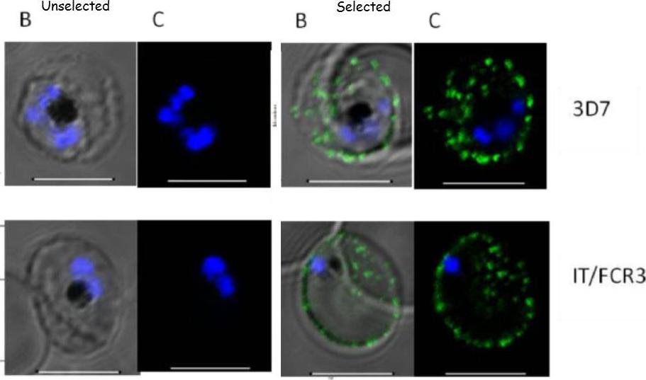 VAR3 on the surface of Plasmodium falciparum infected erythrocytes. Reactivity with anti-VAR3 antibodies of live P. falciparum 3D7 and IT/FCR3 before and after antibody selection with a rabbit antiserum against recombinant DBLα/ζ-DBLε of PFI1820w shown as (B) DIC shadow-cast image with the fluorescence image superimposed and (C) the fluorescence image alone on sero-representative infected erythrocytes in confocal microscopy. Scale bar 5 μM.Wang CW, Lavstsen T, Bengtsson DC, Magistrado PA, Berger SS, Marquard AM, Alifrangis M, Lusingu JP, Theander TG, Turner L. Evidence for in vitro and in vivo expression of the conserved VAR3 (type 3) Plasmodium falciparum erythrocyte membrane protein 1. Malar J. 2012 11(1):129.