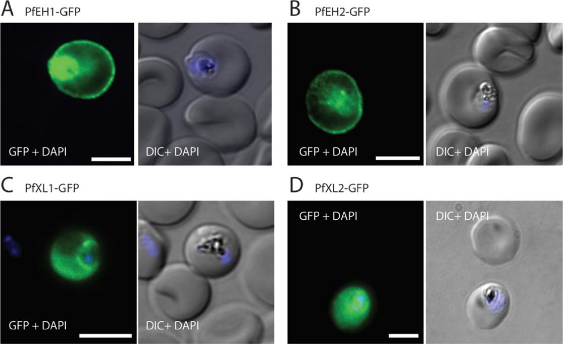 Four a/b-hydrolases are exported into the erythrocyte compartment. Immunofluorescence assay (IFA) of trophozoite/early schizont-stage parasites overexpressing GFP-tagged a/b-hydrolases. Parasites were fixed with paraformaldehyde/glutaraldehyde and stained with anti-GFP (green). The nuclei were stained with 4’,6’-iamidino-2-phenylindole (DAPI) (blue). (A) PfEH1-GFP, (B) PfEH2-GFP, (C) PfXL1-GFP, and (D) PfXL2-GFP. Expression was under control of the constitutive HSP86 promoter. The images are representative of at least three independent experiments. Bars=5 mm. DIC, differential interference contrast. For the two a/b-hydrolase familyA members, fluorescence was observed at the periphery of the infected erythrocyte and within the parasite (A and B). In contrast, for the two family B members, fluorescence was diffuse throughout the cytosol of the infected RBC (C and D).Spillman NJ, Dalmia VK, Goldberg DE. Exported Epoxide Hydrolases Modulate Erythrocyte Vasoactive Lipids during Plasmodium falciparum Infection. MBio. 2016 Oct 18;7(5). pii: e01538-16.