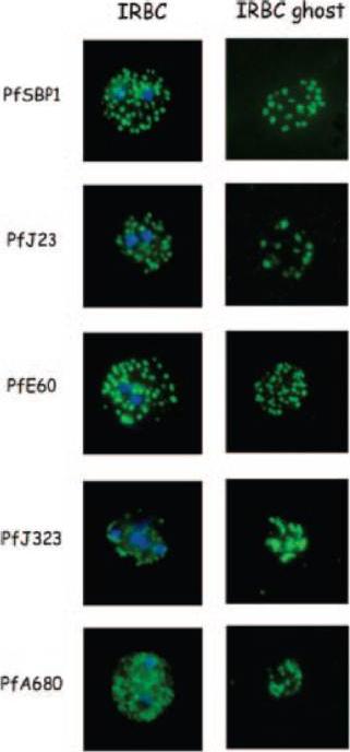 Indirect immunofluorescence of P. falciparum-infected erythrocytes and infected red blood cell (IRBC) ghosts. Air-dried infected red blood cells and infected red blood cell ghosts were incubated with mouse antibodies raised against GST fusion proteins as indicated. The nuclei were stained with DAPI (blue). Negative controls were performed using preimmune sera and anti-GST antibodies (not shown). All proteins are associated with Maurer;s clefts.Vincensini L, Richert S, Blisnick T, Van Dorsselaer A, Leize-Wagner E, Rabilloud T, Braun Breton C. Proteomic analysis identifies novel proteins of the Maurer's clefts, a secretory compartment delivering Plasmodium falciparum proteins to the surface of its host cell. Mol Cell Proteomics. 2005 4:582-93.