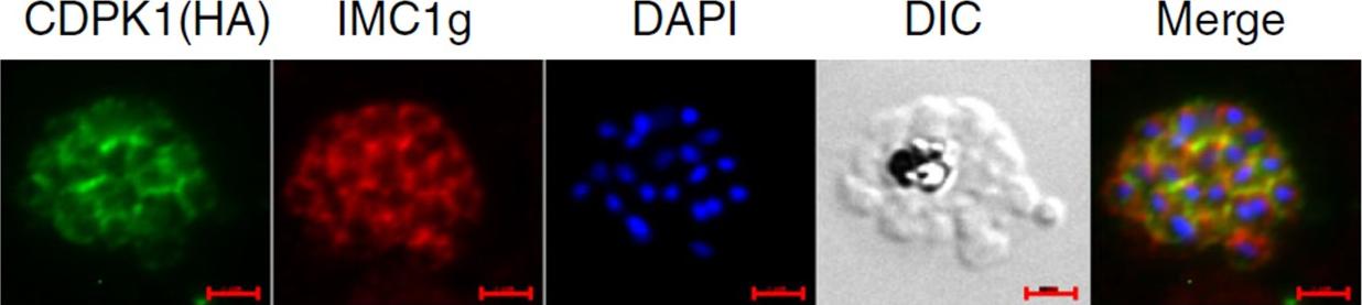 IFA was performed on PfCDPK1-3HA-DD parasites using anti-HA antibody to detect CDPK1 and anti-IMC1g antisera. Scale bar is 2 μm. Data strongly suggest that PfCDPK1 is a major kinase that phosphorylates IMC1g in the parasite. Moreover, PfCDPK1 exhibited localization in close proximity with IMC1g in the parasite, which was reflected by overlapping fluorescence in IFA.Kumar S, Kumar M, Ekka R, Dvorin JD, Paul AS, Madugundu AK, Gilberger T, Gowda H, Duraisingh MT, Keshava Pr asad TS, Sharma P. PfCDPK1 mediated signaling in erythrocytic stages of Plasmodium falciparum. Nat Commun. 2017;8(1):63.