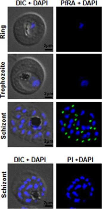 Native protein expression of PfRA in P. falciparum. Immunofluorescence assays were performed on fixed smears of different stages of the P. falciparum intraerythrocytic life cycle. PfRA (green) staining was detected by the anti-PfRA mouse antibodies only in the schizont stages. No signal was observed in trophozoites and schizonts. A distinct punctate staining of PfRA was observed in the schizont which is characteristic of apically localized proteins. Pre-immune antibodies failed to detect any staining. Nuclei were stained with the DNA intercalating dye, DAPI. (Scale bar, 2 μm.)Anand G, Reddy KS, Pandey AK, Mian SY, Singh H, Mittal SA, Amlabu E, Bassat Q, Mayor A, Chauhan VS, Gaur D. A novel Plasmodium falciparum rhoptry associated adhesin mediates erythrocyte invasion through the sialic-acid dependent pathway. Sci Rep. 2016 6:29185.