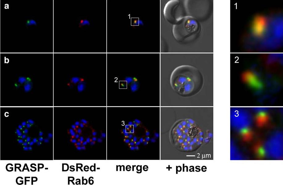 Cis- versus trans-Golgi dynamics during the asexual life cycle of P. falciparum. GRASP–GFP and DsRed–Rab6 were used to visualize the spatial organization of the cis- and trans face of the Golgi in ring stages (a), early (b) and late schizonts (c). The initially close connection between the cis- and trans-face of the Golgi in young parasites (a) appears to expand during maturation (b), resulting in a clearly distinct trans-Golgi compartment in schizonts (c). The boxed regions in a-c are depicted in higher magnification in 1-3.Struck NS, Herrmann S, Schmuck-Barkmann I, de Souza Dias S, Haase S, Cabrera AL, Treeck M, Bruns C, Langer C, Cowman AF, Marti M, Spielmann T, Gilberger TW. Spatial dissection of the cis- and trans-Golgi compartments in the malaria parasite Plasmodium falciparum. Mol Microbiol. 2008 67:1320-30.