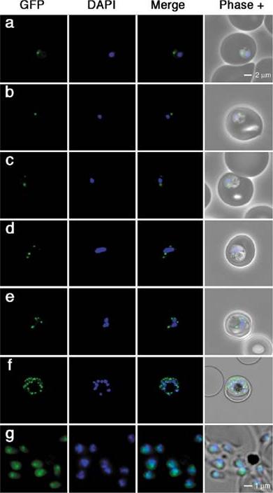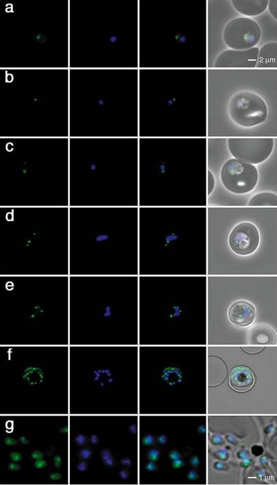 Golgi dynamics throughout the asexual life cycle of Plasmodium. Live images of transgenic parasites expressing PfGRASP-GFP were visualised by confocal microscopy. (a-b) Images 8-16 hours post invasion. In ring-stage parasites PfGRASP-GFP is restricted to one compartment in close proximity to the nucleus (blue). (c) Images 24 hours post invasion. A second Golgi is generated prior to nuclear division. (d-e) Cells 32-40 hours post invasion. As the parasite matures, nuclear division commences and is accompanied by multiplication of the Golgi. (f) Cells 46 hours post invasion. The parasite has nearly reached the final stage of schizogony where each forming merozoite will be equipped with one Golgi and nucleus. (g) Released parasites at 0 hours. Each merozoite has inherited one Golgi. Bar, 2 m (a-f); 1 mm (g).Struck NS, de Souza Dias S, Langer C, Marti M, Pearce JA, Cowman AF, Gilberger TW. Re-defining the Golgi complex in Plasmodium falciparum using the novel Golgi marker PfGRASP. J Cell Sci. 2005 118(Pt 23):5603-13.