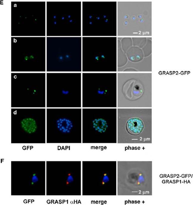 (E) Localisation of GRASP2-GFP in unfixed parasites. Free merozoites display GFP fluorescence in one tightly defined compartment (a). A duplication of this compartment takes place in ring-stage parasites prior to nuclear division (b). As the parasite matures from trophozoite (c) to schizont (d) the organelle further multiplies until one compartment can be equally distributed among the forming progeny. (F) Colocalisation of the two GRASP proteins in the double transgenic parasite line. Immunofluorescence assay of GRASP2-GFP (green) with HA-specific antibodies representing GRASP1 (red). The merged image shows colocalisation of the two compartments. One single GRASP2-GFP compartment in close proximity to the nucleus was observed. in free merozoites (Ea). Duplication of the GRASP2-defined compartment occured prior to nuclear division (Eb) resulting in a multiplicity of Golgi compartments in schizonts (Ec,d).Struck NS, Herrmann S, Langer C, Krueger A, Foth BJ, Engelberg K, Cabrera AL, Haase S, Treeck M, Marti M, Cowman AF, Spielmann T, Gilberger TW. Plasmodium falciparum possesses two GRASP proteins that are differentially targeted to the Golgi complex via a higher- and lower-eukaryote-like mechanism. J Cell Sci. 2008 121(Pt 13):2123-9.