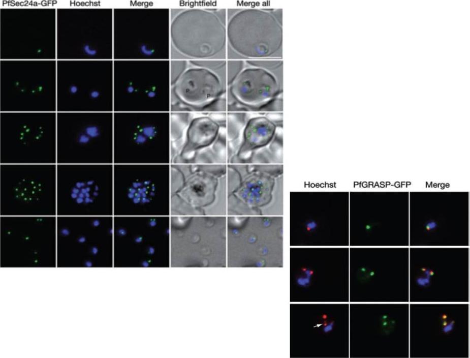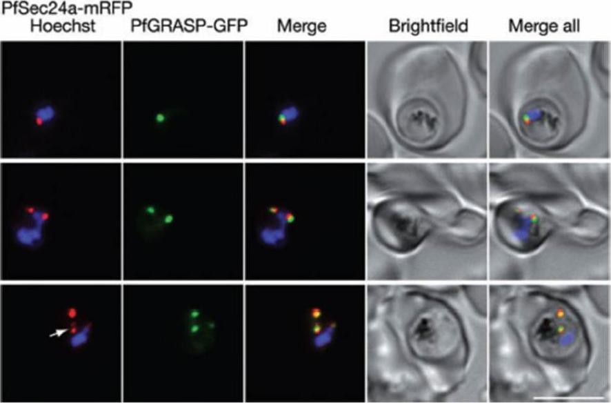 Left Panel: Live cell imaging of parasites expressing PfSec24-GFP (PF13_0324), with nuclei stained with Hoechst 33342. PfSec24a marks distinct foci that likely represent transitional ER sites that are enriched in the COPII vesicle machinery. Parasites at the ring (row 1), trophozoite (row 2), early schizont (row 3) and late schizont (row 4) stages, as well as released merozoites (row 5) are shown. Bar = 5 µM. Right panel: Close apposition of PfSec24a-marked tER sites and Golgi. Parasites expressing PfSec24a–mRFP and PfGRASP–GFP demonstrate a close relationship between the number and location of tER sites and Golgi, as illustrated in three representative parasites.Lee MC, Moura PA, Miller EA, Fidock DA. Plasmodium falciparum Sec24 marks transitional ER that exports a model cargo via a diacidic motif. Mol Microbiol. 2008 68:1535-46.