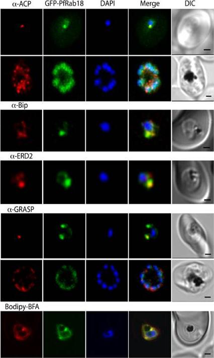 GFP-Rab18 fluorescence co-localizes with ER/Golgi, dense granules or microneme markers. GFP-PfRab1A fluorescence is distinct from the localization of markers for the apicoplast (ACP), the ER (Bip), the Golgi (ERD2 and GRASP), as well as from staining of the ER/Golgi with Bodipy BFA.Morse D, Webster W, Kalanon M, Langsley G, McFadden GI. Plasmodium falciparum Rab1A Localizes to Rhoptries in Schizonts. PLoS One. 2016 11(6):e0158174