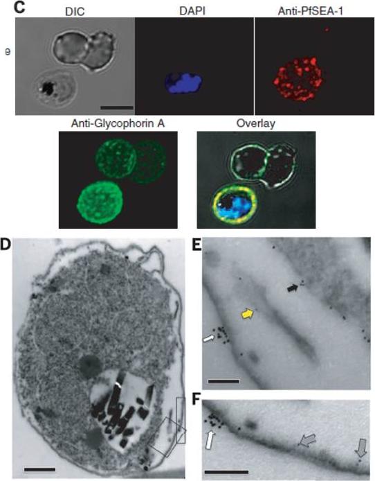 Immunolocalization of PfSEA-1. (C) Nonpermeabilized, unfixed schizont-infected RBCs were probed with mouse anti–PfSEA-1 (red) and rabbit anti–glycophorin A (green) and counterstained with DAPI to label parasite nuclei. PfSEA-1 colocalized with glycophorin A to the surface of schizont-infected RBCs. Scale bar, 5 mm. (D to F) Nonpermeabilized, unfixed schizontinfected RBCs were probed with mouse anti–PfSEA-1 (5-nm gold particles) and rabbit anti–glycophorin A (10-nm gold particles). PfSEA-1 localized to the schizont/parasitophorous vacuole membrane (black arrow), Maurer's clefts (yellow arrow), and the inner leaflet of the RBC membrane (gray arrow), whereas glycophorin A was confined to the outer leaflet of the RBC membrane (white arrow). Scale bar in (D), 0.5 mm. Scale bars in (E) and (F), 0.1 mm.Raj DK, Nixon CP, Nixon CE, Dvorin JD, DiPetrillo CG, Pond-Tor S, Wu HW, Jolly G, Pischel L, Lu A, Michelow IC, Cheng L, Conteh S, McDonald EA, Absalon S, Holte SE, Friedman JF, Fried M, Duffy PE, Kurtis JD. Antibodies to PfSEA-1 block parasite egress from RBCs and protect against malaria infection. Science. 2014 344(6186):871-7.