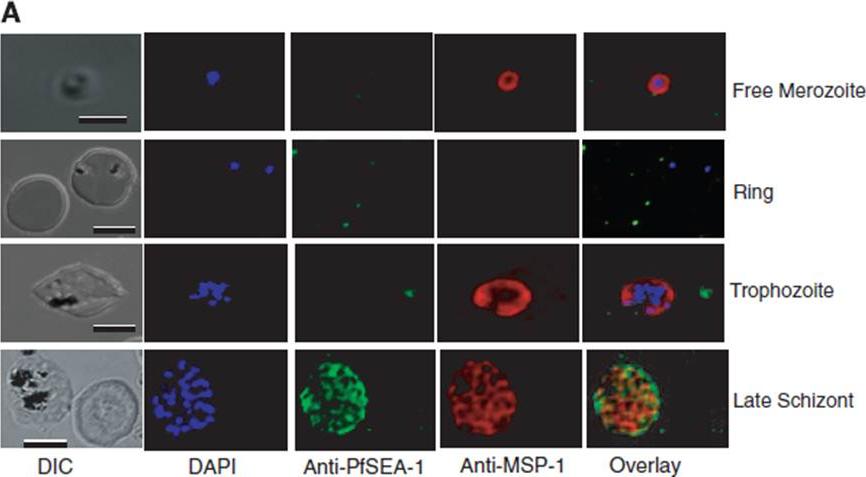 Immunolocalization of PfSEA-1. (A) Infected RBCs were probed with mouse anti–PfSEA-1 (green) and rabbit anti–MSP-1 (red) and counterstained with 4',6'-diamidino-2-phenylindole (DAPI) to label parasite nuclei. PfSEA-1 is detected only in schizont-infected RBCs. Scale bar for free merozoite images, 2 mm. Scale bar for remaining images, 10 mm. Anti–PfSEA-1 did not bind to free merozoites, rings, or late trophozoite–stage parasites, but did specifically recognize an antigen expressed by late schizont–infected RBCs.Raj DK, Nixon CP, Nixon CE, Dvorin JD, DiPetrillo CG, Pond-Tor S, Wu HW, Jolly G, Pischel L, Lu A, Michelow IC, Cheng L, Conteh S, McDonald EA, Absalon S, Holte SE, Friedman JF, Fried M, Duffy PE, Kurtis JD. Antibodies to PfSEA-1 block parasite egress from RBCs and protect against malaria infection. Science. 2014 344(6186):871-7.