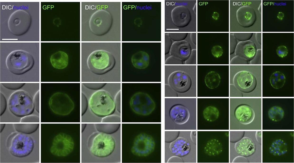 Proteins with TM that are located in the PV. Live cell microscopy images of the endogenously GFP-tagged alkaline phosphatase and EXP3. Left panel: a young and an old schizont are shown to illustrate the change from a staining surrounding the bulk of the still forming merozoites (third row of images) to a ‘bunch of grape’ type pattern where each merozoite is surrounded by GFP signal after the PPM is invaginated (bottom row of images). Right panel: a late trophozoite (third row of images), a young schizont (fourth row of images) and a late schizont (bottom row of images) are shown to demonstrate the change from a peripheral to a parasite internal staining .Khosh-Naucke M, Becker J, Mesén-Ramírez P, Kiani P, Birnbaum J, Fröhlke U, Jonscher E, Schlüter H, Spielmann T. Identification of novel parasitophorous vacuole proteins in P. falciparum parasites using BioID. Int J Med Microbiol. 2017 Jul 27. [Epub ahead of print]