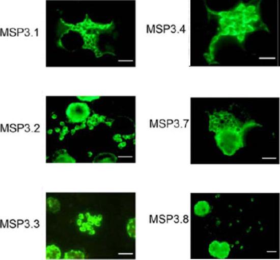 Expression analysis of MSP3-like ORFs. IFA analysis of acetone-fixed thin smear of the blood stage parasites, using the same antibodies used for Western blot analysis, shows merozoite surface staining. The size-bar drawn in the lower right-hand corner of each microscopic field represents 5 mm. Antibodies affinity-purified against the unique region of MSP3.5 did not react to parasite proteins in IFA.Singh S, Soe S, Weisman S, Barnwell JW, Pérignon JL, Druilhe P. A conserved multi-gene family induces cross-reactive antibodies effective in defense against Plasmodium falciparum. PLoS One. 2009;4(4):e5410.