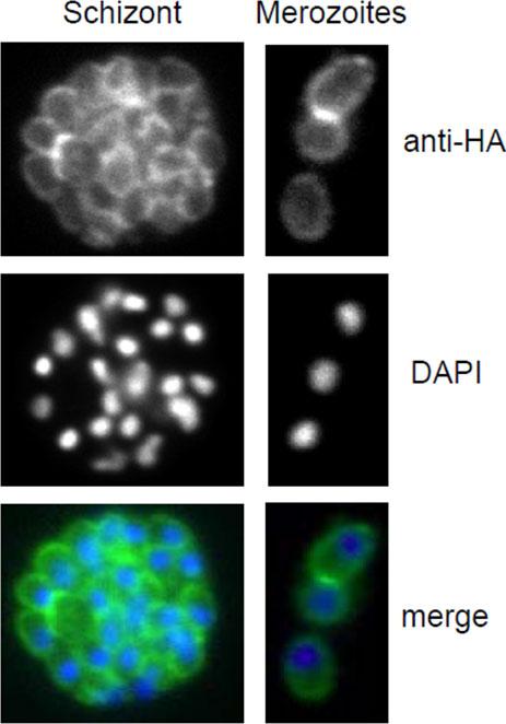 Immunofluorescence of a representative schizont and representative merozoites of the DR line using anti-HA antibodies (green) and DAPI staining (blue). MSPDBL2 localizes to the merozoite surface, despite lacking a membrane anchor.Van Tyne D, Uboldi AD, Healer J, Cowman AF, Wirth DF. Modulation of PF10_0355 (MSPDBL2) alters Plasmodium falciparum response to antimalarial drugs. Antimicrob Agents Chemother. 2013 57(7):2937-41