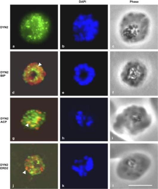 PfDYN2 localizes to vesicle-like structures in parasites. IFA of schizont-infected erythrocyte using anti-PfDYN2 (green, a-c). Merged images of PfDYN2 (green) and the ER PfBIP PF11_0098 (red, d-f), the apicoplast PfACP PFB0385w (red, g-i) and the Golgi apparatus PfERD2 PF13_0280 (red, j-l). In blue, DAPI-stained DNA and in right panels, phase contrast images. Co-localizations are indicated by arrowheads and appear under orange-yellow color. Bar = 5 mm. PfDYN2 partly colocalized with markers of the parasite endoplasmic reticulum, Golgi apparatus and apicoplast, suggesting it could be implicated in vesicular trafficking and/or organelle fission events known to occur during the last hours of the parasite development in erythrocytes. Charneau S, Bastos IM, Mouray E, Ribeiro BM, Santana JM, Grellier P, Florent I. Characterization of PfDYN2, a dynamin-like protein of Plasmodium falciparum expressed in schizonts. Microbes Infect. 2007 9:797-805.