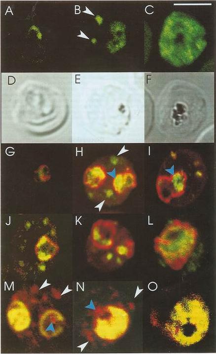 Confocal immunofluorescence of PfSar1p. Panels A-C: Parasitized erythrocyes (D10 strain) were labeled with affinity purified anti=PfSar1p antiserum followed by fluorescein-conjugated anti-rabbit antiserum (green). Panels D-F: Transmission images of panels A-C. Panels G-L: Dual labeling of affinity-purified rabbit anti-PfSar1p antiserum followed by fluorescein-conjugated anti-rabbit antiserum (green) and a murine monoclonal antibody recognizing the parasitophorous vacuole-located protein, Exp-1, followed by rhodamine-conjugated anti-mouse antiserum (red). Sar1p in the trophozoite is clearly located in the erythrocyte cytosol (G-K) and in the schizont it occupies most of it (L). Panels M-O: Dual labeling of affinity-purified rabbit anti-PfSar1p antiserum followed by rhodamine-conjugated anti-mouse antiserum (red) and a biotin-conjugated anti-PfERC antiserum followed by fluorescein-conjugated anti-rabbit antiserum (green). PfERC and PfSar1p labeling patterns do not completely coincide, indicating that PfSar1p is not confined to the ER. An optical slice was collected through the center of the parasite by confocal microscopy. Some PfSar1p-containing structures in the erythrocyte cytosol are marked with white arrowheads. Some PfSar1p-containing structures in the parasite cytosol are marked with blue arrowheads. The bar in panel C corresponds to 5 mm.Albano FR, Berman A, La Greca N, Hibbs AR, Wickham M, Foley M, Tilley L. A homologue of Sar1p localises to a novel trafficking pathway in malaria-infected erythrocytes. Eur J Cell Biol. 1999 78:453-462. Copyright Elsevier 2010.