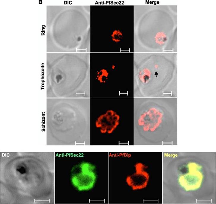 Immunofluorescence microscopy of fixed cells using anti-PfSec22 antibodies and goat anti-rabbit Alexa Fluor 555 secondary antibodies. An intense ring of PfSec22 fluorescence is visible in ring- and trophozoite-infected cells. Isolated foci of PfSec22 fluorescence (arrow) are also detected in the host cell compartment in trophozoite-infected cells, suggesting export of PfSec22 into the erythrocyte cytosol. Scale bars, 2 mm.Bottom row: Coimmunolocalization and membrane association of endogenous PfSec22. The association of PfSec22 with the parasite ER was investigated by coimmuno-fluorescence assays using rabbit anti-PfSec22 and rat anti-PfBip antibodies, as indicated. Both proteins colocalized significantly within the parasite. Scale bars, 2 mm.Ayong L, Raghavan A, Schneider TG, Taraschi TF, Fidock DA, Chakrabarti D. The Longin domain regulates the steady-state dynamics of Sec22 in P. falciparum. Eukaryot Cell. 2009 8(9):1330-40.