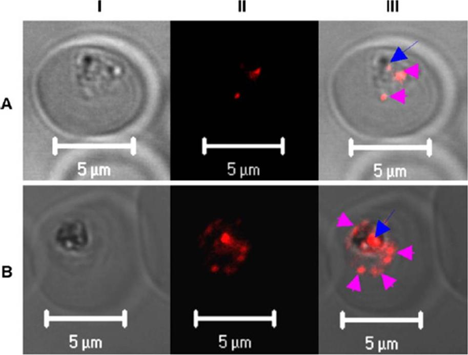 Immunolocalization of PfPRL in P. falciparum infected erythrocytes. The images represent the distribution patterns of PfPRL in P. falciparum intraerythrocytic stages. Synchronous 3D7 parasite cultures were probed with affinity purified rabbit anti-PfPRL followed by incubation with Alexa-Fluor 555-conjugated anti-rabbit IgG. (A) Two cytoplasmic foci (red arrowheads) and a single food vacuole-associated site (blue arrow) of anti-PfPRL reactivity are observed in mid-trophozoite stage parasites. (B) Schizont stage parasite showing increase in number of PfPRL-associted puncta during parasite development. Panel I is differential interference contrast image, panel II is fluorescence due to Alexa-Fluor 555 (red), and panel III is a merge of the first two panels.Pendyala PR, Ayong L, Eatrides J, Schreiber M, Pham C, Chakrabarti R, Fidock DA, Allen CM, Chakrabarti D. Characterization of a PRL protein tyrosinephosphatase from Plasmodium falciparum. Mol Biochem Parasitol. 2008 158(1):1-10. PMID: 18096253