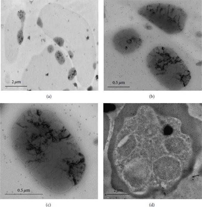 Localization of PfMAP2 by immunoelectron microscopy. Ultrathin sections of P. falciparum parasites at intraerythrocyte stage were labelled with rabbit anti-PPfMAP2 antibody followed with anti-rabbit secondary antibody conjugated with 15 nmcolloidal gold particle. Ultrathin sections of infected erythrocyte were observed under 7 000x (a), 25 000x (b), and 40 000x (c) magnification. Similarly PPfMAP2 staining in the schizont was observed under 8 000x magnification (d). the immunogold was detected in various vesicular structures including nucleus. Since we do not have a specific PPfMAP2 antibody which is nucleus-specific, we have come to understand that the expression of PfMAP2 is regionalised in various organelles of the Plasmodium parasite.Dahalan FA, Sidek HM, Murtey MD, Embi MN, Ibrahim J, Fei Tieng L, Zakaria NA, Abdul-Aziz NM. Phosphorylated and Nonphosphorylated PfMAP2 Are Localized in the Nucleus, Dependent on the Stage of Plasmodium falciparum Asexual Maturation. Biomed Res Int. 2016;2016:1645097.