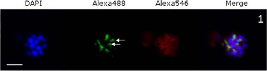Confocal immunofluorescence microscopic images of P. falciparum schizonts treated with: Schizonts were stained with DAPI (nuclear stain), Alexafluor-488 (PfRAP1) and Alexafluor-546 (PfCYP19B). White scale bars indicate 5 μM. White arrows show characteristic bi-punctate rhoptry staining. Immuno-staining schizonts for RAP1 under normalconditions resulted in the bi-punctate staining characteristic of rhoptry proteins, while PfCYP19B waslocated in the cytoplasm as expected.Leneghan D, Bell A. Immunophilin-protein interactions in Plasmodium falciparum. Parasitology. 2015 Jul 9:1-11. [Epub ahead of print] PubMed PMID: 26156578