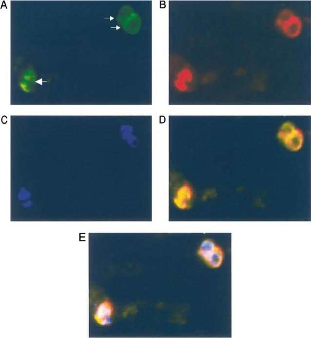 Subcellular location of PfCyP-19B determined by immunofluorescence. Trophozoite cultures were prepared for immunofluoresence as described in Section 2, using primary rabbit antibodies to PfCyP-19B and mouse antibodies to LDH, secondary FITC-conjugated anti-rabbit IgG and TRITC-conjugated anti-mouse IgG antibodies, and DAPI stain. Two singly infected erythrocytes (small arrows) and a doubly infected erythrocyte (large arrow) can be seen in this representative picture. Panel A: FITC image (PfCyP-19B); Panel B: TRITC image (LDH); Panel C: DAPI image (nuclear stain); Panel D: FITC and TRITC images superimposed; Panel E: FITC, TRITC, and DAPI images superimposed. Experiments using the different fluorophores separately confirmed that there was no significant cross-fluorescence using any of the filter sets. the protein appeared surprisingly to be distributed throughout the cell, as though it were located in the cytosol.Gavigan CS, Kiely SP, Hirtzlin J, Bell A. Cyclosporin-binding proteins of Plasmodium falciparum. Int J Parasitol. 2003 Aug;33(9):987-96.
