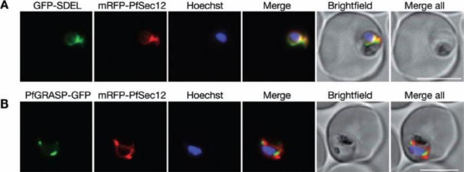 Comparison of PfSec12 localization with markers for the ER and Golgi. Parasites were cotransfected with plasmids for expression of mRFP-PfSec12 (from the native pfsec12 5′ UTR) with either (A) GFP-SDEL, a marker for the general ER, or (B) PfGRASP-GFP, a cis-Golgi marker. mRFP-PfSec12 was localized throughout the ER coincident with GFP-SDEL, in close apposition to PfGRASP-labelled Golgi. Bar = 5 μm.Lee MC, Moura PA, Miller EA, Fidock DA. Plasmodium falciparum Sec24 marks transitional ER that exports a model cargo via a diacidic motif. Mol Microbiol. 2008 68(6):1535-46.