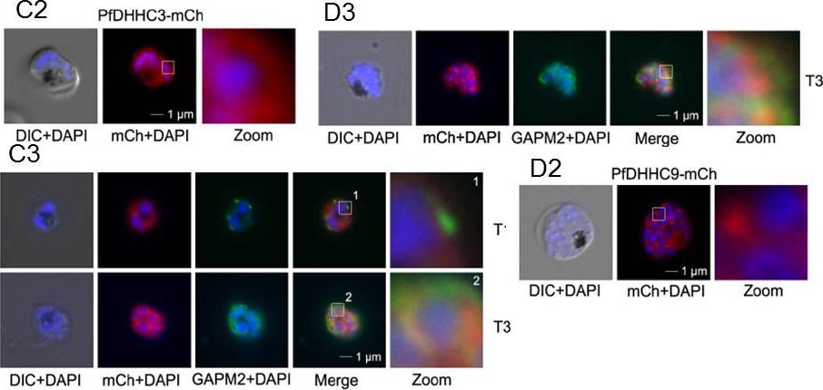 Over-expression and localization of PfDHHC3 and PFDHHC9 (PF11_0167) in late stage parasites. C. Expression of PfDHHC3-mCherry. C. Expression of PfDHHC3-mCherry. C2. Microscopic analysis located this GFP-fusion protein in the periphery of the nascent merozoites. C3. Co-localization with the IMC marker GAPM2 (anti-GAPM2, green) in fixed cells shows differential localization of PfDHHC2-mCherry with the IMC localization in early stages (T1) and colocalization in nascent merozoites (T3) consistent with plasma membrane association. Scale bar, 1 μm. D.Expression of PfDHHC9-mCherry. D2. Microscopy localized this fusion protein mainly in apical structures in the parasite. D3. Co-localization with the IMC marker GAPM2 (anti-GAPM2, green) in fixed cells shows differential localization of PfDHHC9 with the IMC (T3). Scale bar, 1 μm.Wetzel J, Herrmann S, Swapna LS, Prusty D, Peter AT, Kono M, Saini S, Nellimarla S, Wong TW, Wilcke L, Ramsay O, Cabrera A, Biller L, Heincke D, Mossman K, Spielmann T, Ungermann C, Parkinson J, Gilberger TW. The role of palmitoylation for protein recruitment to the inner membrane complex of the malaria parasite. J Biol Chem. 2014 Nov 25.