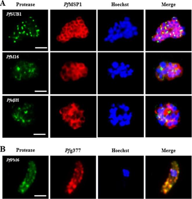 In-depth analysis of protease localization. A) IFAs using polyclonal mouse antisera directed against PfSUB1, PfαβH and PfM16 were used to investigate the granular localization of these proteases in merozoite-containing mature schizonts (in green). The merozoites were visualized via immunolabelling with polyclonal rabbit antisera directed against PfMSP1 (in red). PfM16 localized to granular structures in schizonts, which did not coincide with the merozoites B) Immunolabeling of osmiophilic bodies using polyclonal rabbit antisera directed against Pfg377 (in red) was employed to demonstrate an accumulation of PfPM6, labeled with the respective mouse antisera (in green), in these organelles. Hoechst 33342 staining was used to highlight the parasite nuclei (in blue). Bar, 2 μm. Results are representative of two independent experiments. The localization of PfPM6 in female gametocytes was don by co-localization experiments were performed, using rabbit antibodies directed against the osmiophilic body protein Pfg377. The double-labelling assays demonstrated that PfPM6 is present in these organelles.Weißbach T, Golzmann A, Bennink S, Pradel G, Julius Ngwa C. Transcript and protein expression analysis of proteases in the blood stages of Plasmodium falciparum. Exp Parasitol. 2017 Mar 25. [Epub ahead of print]