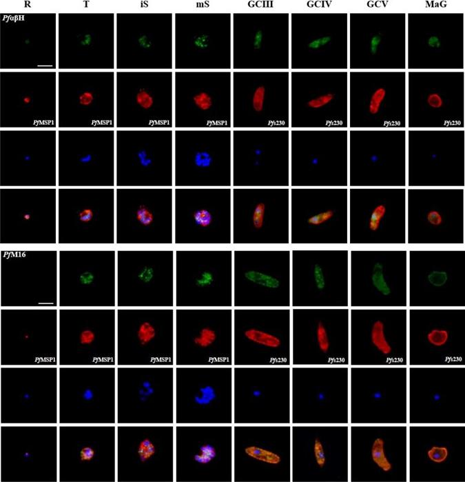 Protein expression profile of selected P. falciparum proteases. IFAs using polyclonal mouse antisera directed against 12 of the proteases was used to demonstrate protein expression in the asexual blood stages (R, ring; T, trophozoite; iS, immature schizont; mS, mature schizont) and gametocytes (GC stages III, IV and V) as well as in macrogametes (MaG) at 20 min post-activation (in green). The asexual and the sexual blood sstages were visualized via immunolabelling with polyclonal rabbit antisera against PfMSP1 and Pfs230, respectively (in red). Hoechst 33342 staining was used to highlight the parasite nuclei (in blue). Bar, 5 μm. Results are representative of three to four independent experiments.Weißbach T, Golzmann A, Bennink S, Pradel G, Julius Ngwa C. Transcript and protein expression analysis of proteases in the blood stages of Plasmodium falciparum. Exp Parasitol. 2017 Mar 25. [Epub ahead of print]