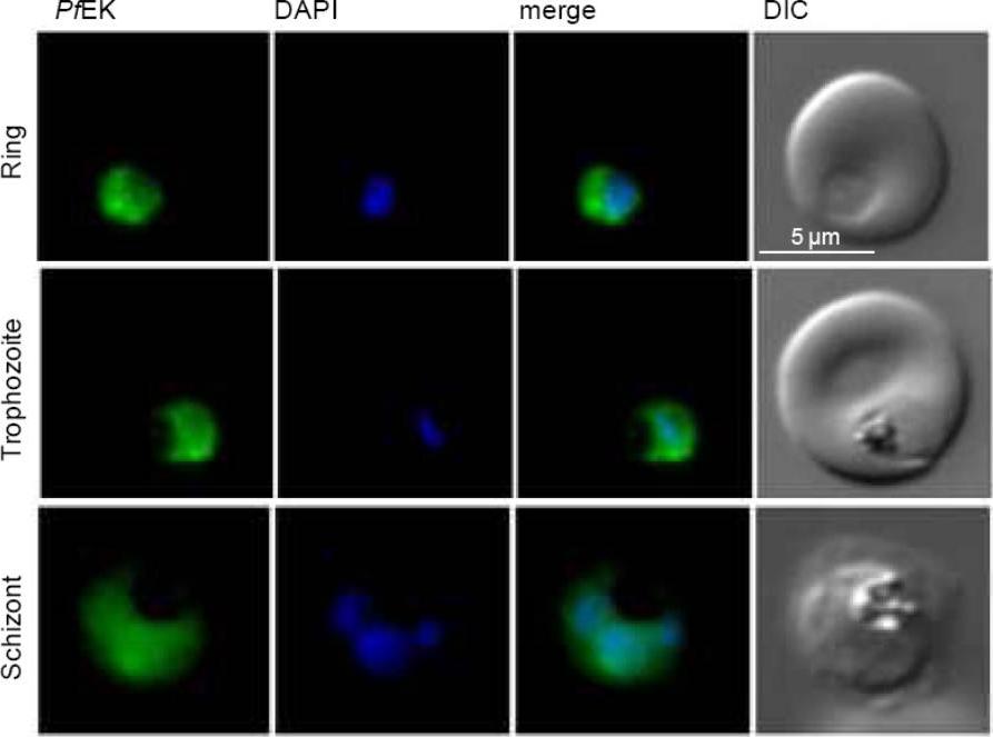 Immunofluorescence assays were done on human red blood cells infected by P. falciparum 3D7 strain and revealed by anti-PfEK. Nuclei stained blue with DAPI. Differential interference contrast (DIC) images and merges are shown. Three representative parasitic stages are shown: ring, mature trophozoite and schizont. The antibody was seen to be spread throughout the parasite cytoplasm.Alberge B, Gannoun-Zaki L, Bascunana C, Tran Van Ba C, Vial H, Cerdan R. Comparison of the cellular and biochemical properties of Plasmodium falciparum choline and ethanolamine kinases. Biochem J. 425:149-58, 2009 © The Biochemical Society 2009.