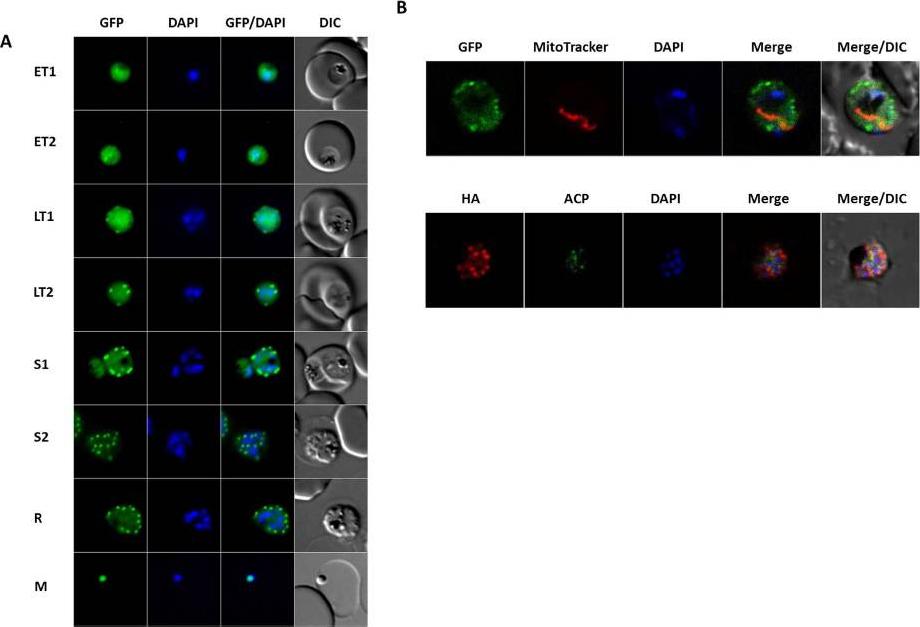 FPPS/GGPPS localization. Images of live parasites (FPPS/GGPPS-HA-GFP strain) expressing GFP and immunofluorescence of the FPPS/GGPPS-HA strain visualized by fluorescence or confocal microscopy. (A) Images of live parasites FPPS/GGPPS-HA-GFP by fluorescence microscopy during the intra-erythrocytic cycle of the parasite. (B) Bottom -immunofluorescence of the FPPS/GGPPS-HA strain with antibody as indicated, visualized by confocal microscopy. Top—Images of live FPPS/GGPPS-HA-GFP parasites with markers as indicated, visualized by confocal microscopy. ET1 (early rophozoites); ET2 (early trophozoites); LT (latetrophozoites); LT (late trophozoites) S1 (schizont); S2 (schizont); R (rosettes); M (Merozoites); DAPI (nucleus marker). Original magnification for all images: 1.000×Gabriel HB, de Azevedo MF, Palmisano G, Wunderlich G, Kimura EA, Katzin AM, Alves JM. Single-target high-throughput transcription analyses reveal high levels of alternative splicing present in the FPPS/GGPPS from Plasmodium falciparum. Sci Rep. 2015. PMID: