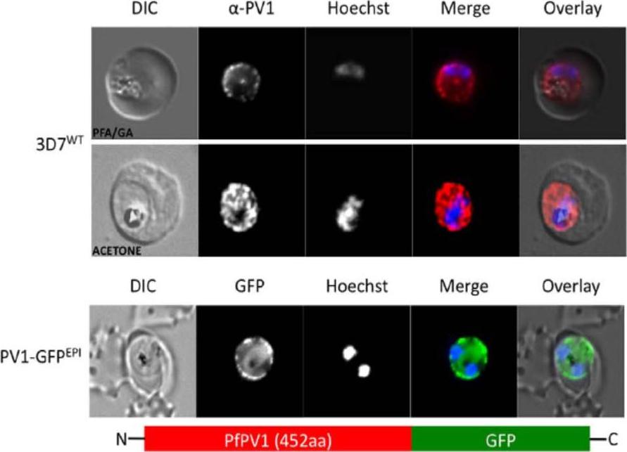 Localisation of PfPV1. (A, upper and middle panel) Immunofluorescence localisation using specific anti-PfPV1 antibodies. Lower panel: Episomal expression of a PfPV1-GFP chimera. DIC, differential interference contrast; GFP, green fluorescent protein; Hoechst, nuclear staining. GFP, green; specific antibody, red; Hoechst, blue. The imaging reveals GFP fluorescence in a ‘‘ring of beads’’ around the parasite, presumably the parasitophorous vacuole.Chu T, Lingelbach K, Przyborski JM. Genetic evidence strongly support an essential role for PfPV1 in intra-erythrocytic growth of P. falciparum. PLoS One. 2011 6(3):e18396.